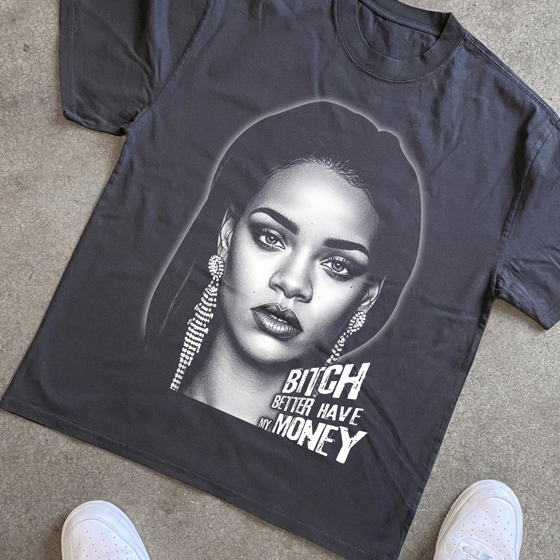 Make a bold statement with the Rihanna – Bitch Better Have My Money Heavyweight Black T-Shirt, inspired by the unapologetic attitude and powerful energy of Rihanna’s hit track Bitch Better Have My Money. This graphic tee captures the fierce confidence and edgy aesthetic that define one of Rihanna’s most iconic eras.